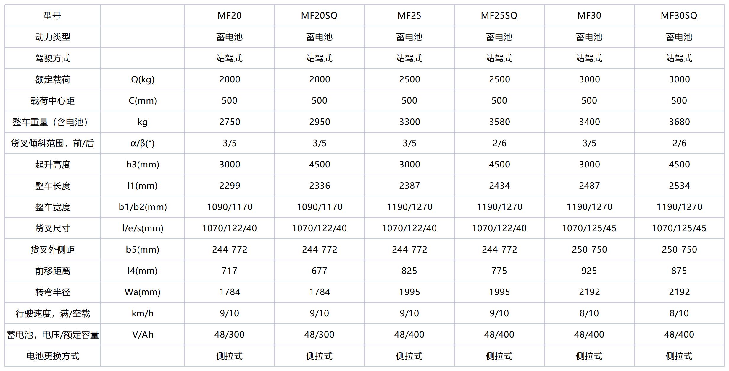 MF系列是新款的站驾式前移叉车,承载能力2吨~3吨,车身体积小转弯半径小,可大大提高仓储能力和作业效率。